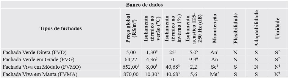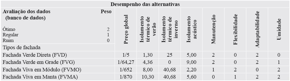 Para pontuar os critérios de cada tipo de fachada verde, foram usados dados quantitativos nos quatro primeiros critérios, sendo eles os mesmos valores do banco de dados, e dados qualitativos para os quatro últimos critérios, em uma escala de 0 a 2, como indicado na Tabela 3. Esta escala foi empregada para os critérios: Manutenção, Flexibilidade, Adaptabilidade e Umidade. No caso da manutenção, a classificação já é composta por 3 níveis (Mensal = nota 0; Semestral = Nota 1 e Anual = Nota 2). Para a flexibilidade e adaptabilidade o padrão de resposta é binário, porém, manteve-se os 3 níveis de modo que a resposta “Não = Nota 0” e a resposta Sim pode ser convertida em Nota 1 ou 2 para dar a possibilidade de o decisor classificar o nível de adaptabilidade e flexibilidade como regular ou ótimo. No caso da umidade, o padrão de resposta também é binário (Sim ou Não), porém, o comportamento é invertido em relação aos dois anteriores, pois a entrada de água na parede é considerada uma falha de desempenho para o ususário.