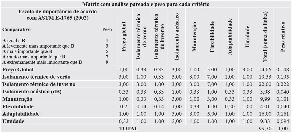 A matriz de decisão deste trabalho foi elaborada com o conhecimento técnico sobre o assunto, para se obter o posicionamento final de acordo com a importância de cada critério (Tabela 2). Para isso, utilizou-se uma escala de importância indicada pela norma ASTM E 1765 (ASTM, 2011) para estimativa de um peso relativo para cada critério. Essa norma americana trata da aplicação de Analytic Hierarchy Process (AHP) para análise de decisões relacionadas a investimentos na área de construções e de sistemas construtivos.