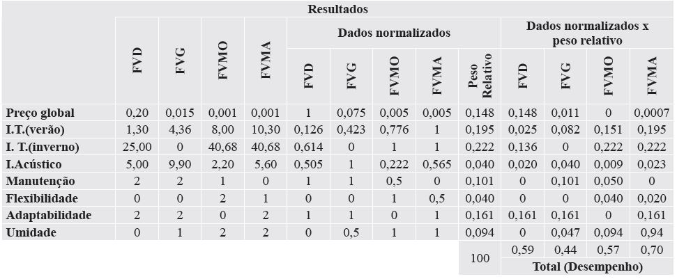 Os valores obtidos na classificação de cada um dos quatro sistemas, de acordo com suas características, foram inseridos na Tabela 4 onde cada valor de uma dado critério (linha) foi dividido pelo maior valor desta mesma linha do critério. Por exemplo, no caso do critério Preço Global, para se obter os dados normalizados, os valores desta variável para os quatro sistemas de fachadas vegetais foram divididos por 0,20, maior valor da linha. Esta prática se chama normalização dos dados e tem a função de fazer com que todos os critérios sejam representados em uma escala padrão que varia de 0 a 1. Em seguida, cada valor obtido por essa divisão foi multiplicado pelo peso relativo de cada critério, como já representado na última coluna da Tabela 2. Por fim, fez-se uma última somatória dos valores de cada sistema, obtendo uma pontuação final na qual o maior valor pontuado entre os quatro sistemas é considerado a melhor indicação.