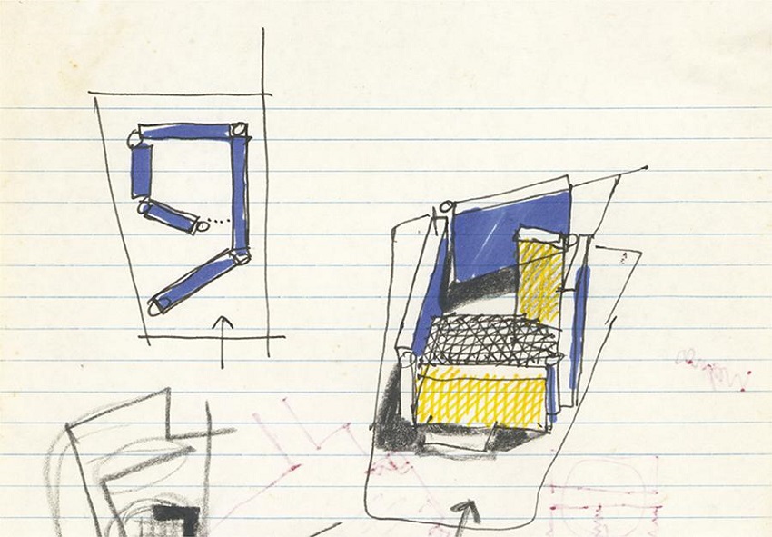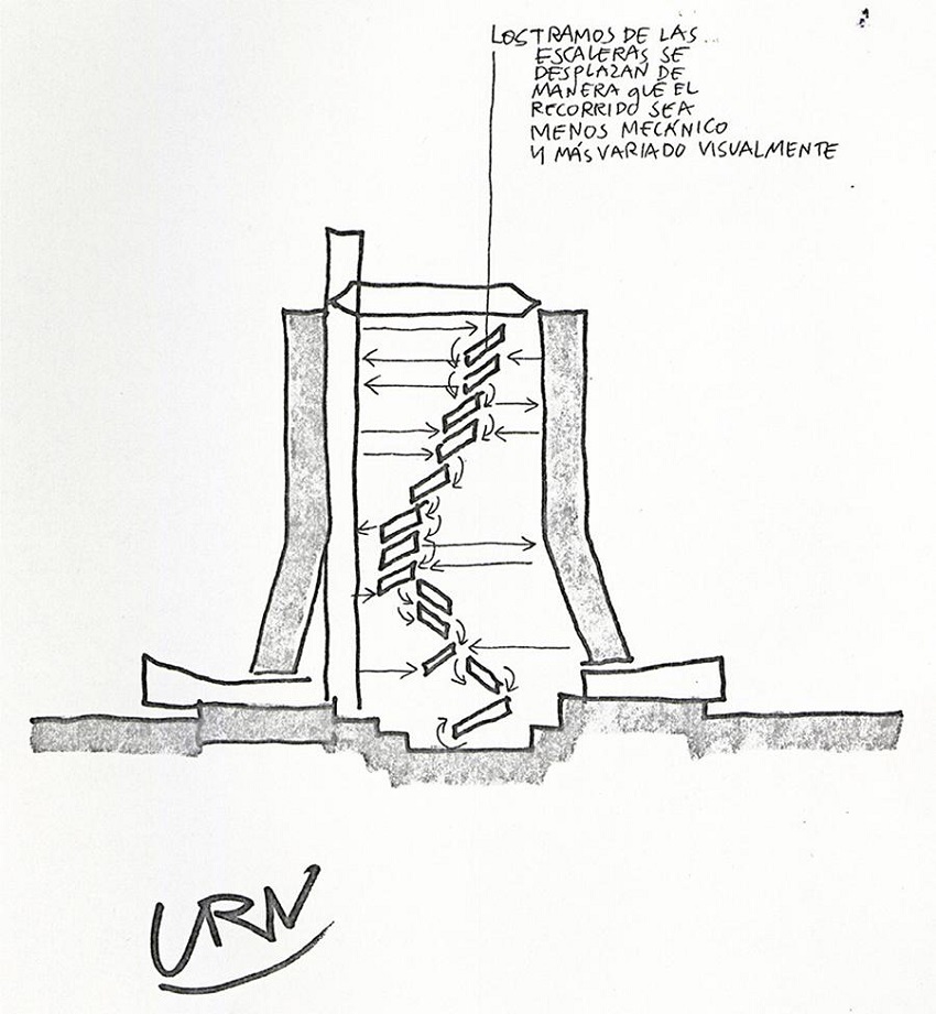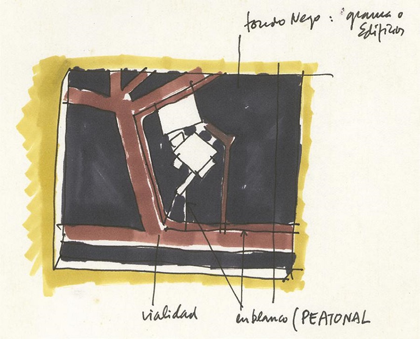 Como en muchos otros proyectos, antes de asumir una posición autónoma de la forma, aunque anclada a la geometría de la parcela, ensayó configuraciones abiertas que seguían los ángulos de ésta. Dos dibujos previos a la propuesta entregada (Figura 4), en base a cinco bloques de distintas alturas y longitudes, articulados por núcleos cilíndricos, así lo demuestran. Esta exploración le permite reflexionar sobre la economía del conjunto cerrado y adoptarlo como concepto del anteproyecto (Figura 5). La idea del gran espacio interior, inédito en el campus, ya está presente con la cubierta cerchada.