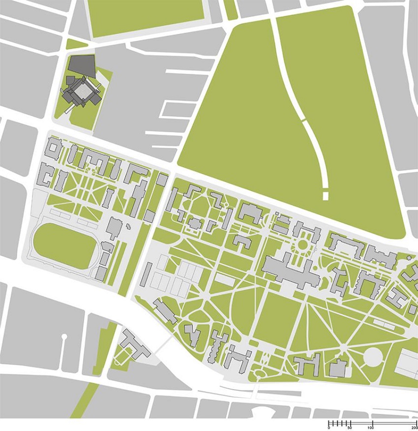 Así pues, en base a la investigación realizada, podemos establecer que la ubicación precisa del proyecto es la parcela de 15.680 m2 aproximados que ocupaba la École sobre el bulevar Jourdan, con frentes a la histórica calle de la Tombe Issoire20 y a la avenida Reille21 (Figura 3). Al superponer el anteproyecto en la parcela real, se verificó un ligero error en la geometría de la parcela debido, sin duda, a la falta de un levantamiento preciso durante el proceso de proyecto.