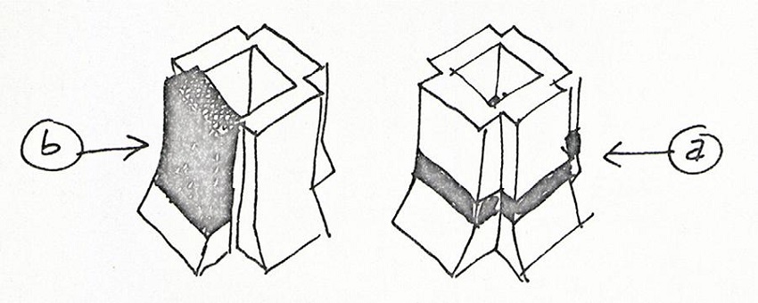 La residencia es el resultado de la suma de unidades básicas, que se agrupan en otras cada vez mayores y más complejas. Habitaciones y servicios sanitarios crearán la unidad habitacional: el bloque. Y cuatro de éstos definirán el espacio común central. A la torre resultante se acoplarán en su base los usos complementarios, como ya hizo en “El Paraíso”. Recordemos que Villanueva propone agrupar las cuatro residencias en base a un principio de economía, además de los motivos sociales, para concentrar las áreas comunes y optimizar los servicios de mantenimiento. Las divisiones nacionales se podrían hacer tanto horizontal (a) como verticalmente (b) (Figura 7).