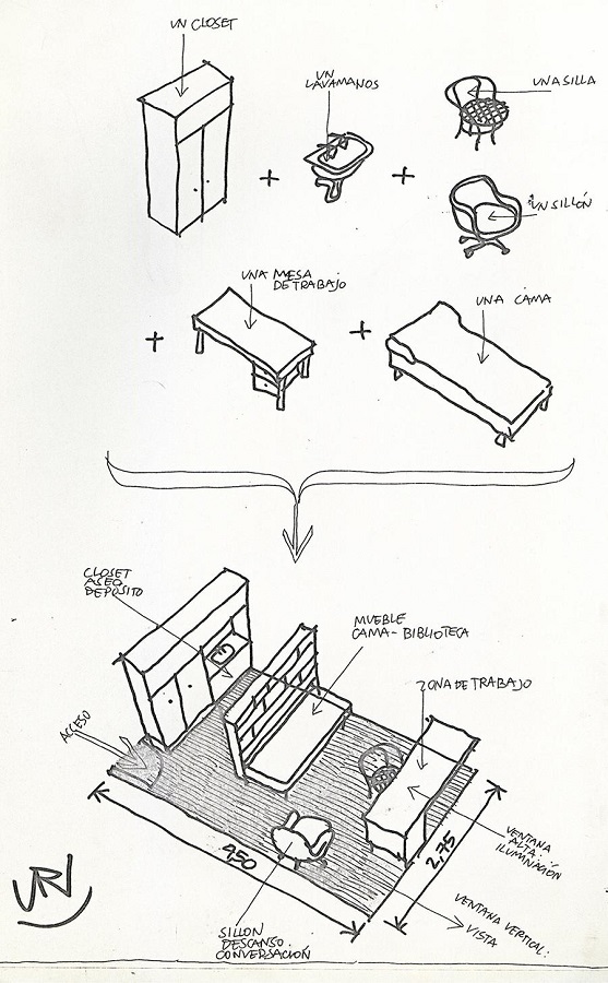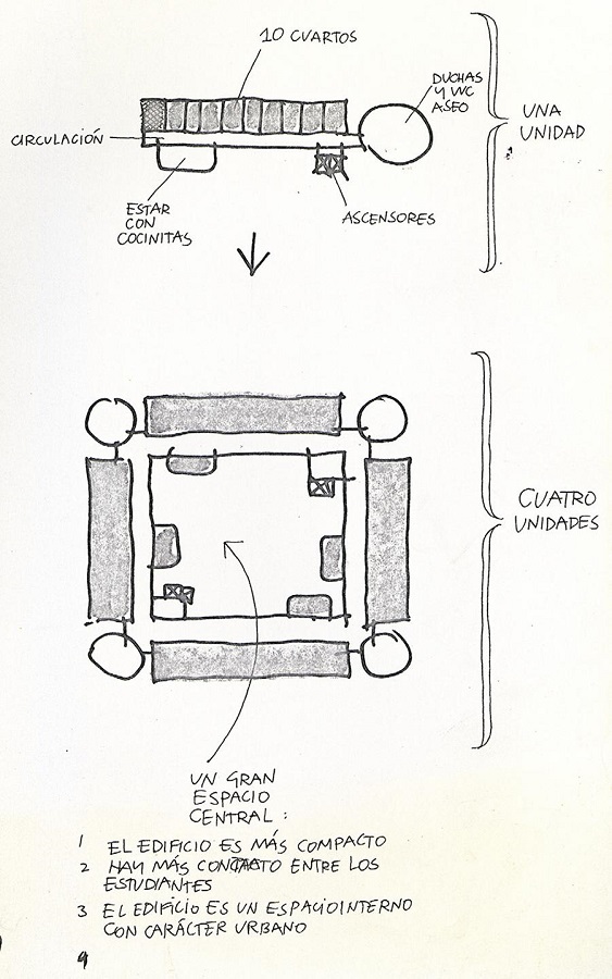 Villanueva inicia la memoria, relatando su proceso de proyecto, con un esquema muy básico del funcionamiento de la residencia, estableciendo las relaciones que han de existir entre las zonas de descanso y de trabajo, y a su vez con las áreas comunes de esparcimiento e higiene. Al mismo tiempo se detiene en las cualidades que la habitación debe tener: “A. Suficiente espacio para: estudiar, dormir, asearse, reunirse con otros” y “B. Diferentes arreglos para que cada estudiante pueda construir su espacio”24.