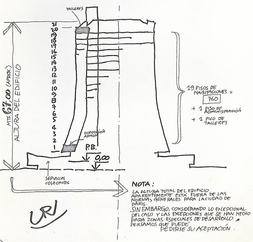 Parte de las objeciones técnicas de los directivos de la CIUP estaban fundamentadas justamente en aspectos higienistas y el problema que significaría para el vecino Hôpital International Université de Paris una torre de tal envergadura, además del riesgo de deshumanización que supondría un edificio para 700 personas. Con esos argumentos le emplazan a que respete el programa propuesto y los lineamientos generales de la Cité, en tanto lo ideal sería la construcción de cinco pequeñas residencias, con un planteamiento común, pero sin caer en la monotonía15.