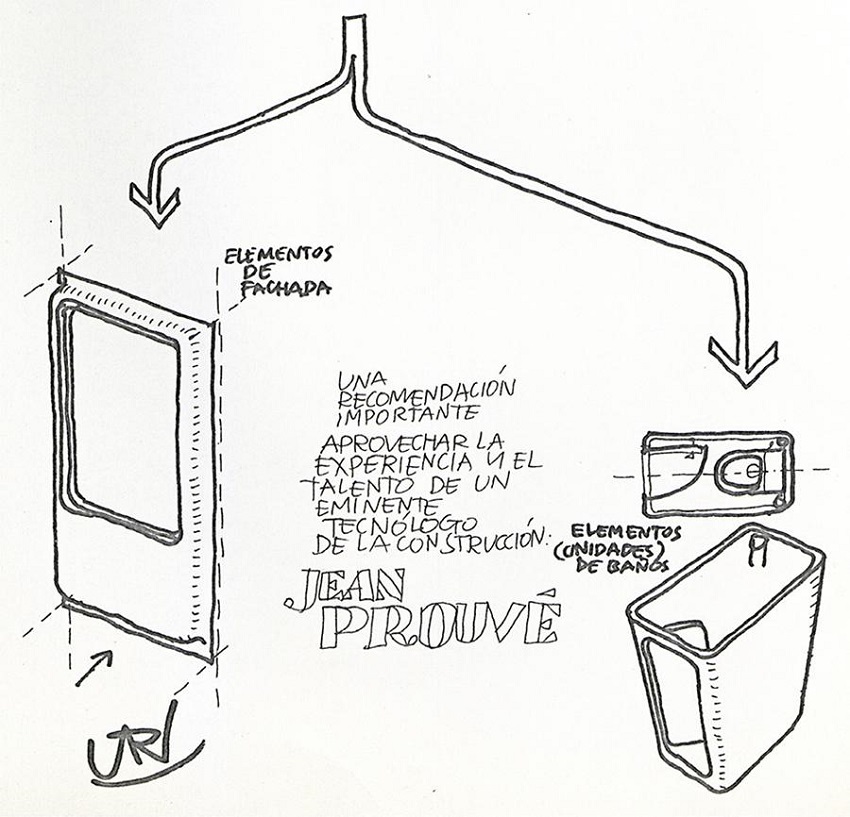 La única referencia constructiva de la memoria es un dibujo de elementos prefabricados de fachada y una cápsula sanitaria, señalando su intención de “aprovechar la experiencia y el talento de un eminente tecnólogo de la construcción: Jean Prouvé” (Figura 13). Por la correspondencia, sabemos que este propósito trascendió la buena intención y, sin saber en qué grado y de qué manera, Villanueva “tuvo el placer de trabajar con el arquitecto Daniel Michelin y el ingeniero Jean Prouvé”30 en la elaboración del croquis del “plan de masas”.
