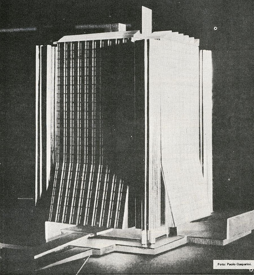 En efecto, el elemento de fachada se asemeja mucho al desarrollado por el ingeniero francés en 1963, en aluminio (280 x 120 x 6,5 cm), para la CIMT (Compagnie Industrielle du Matériel de Transport) en Neuilly sur Seine, y también al de 1969, en aluminio y vidrio (268 x 178,5 x 6 cm), para el Institut de l’environnement de París. No obstante, ni los dibujos ni la maqueta tienen el nivel de detalle para identificar un cerramiento de ese tipo. Aunque podría tratarse de una doble piel, con cámara ventilada, como la que acababa de implementar Prouvé con gran éxito en el muro cortina de la Tour Nobel31, en el distrito de La Défense. Lo que sí muestra la maqueta con claridad es el acabado brillante del cerramiento, propio de materiales reflectantes como el aluminio y el vidrio (Figura 14), otra excepción en la trayectoria moderna de Villanueva, construida en hormigón mate. Una caja brillante por fuera y vibrante por dentro.