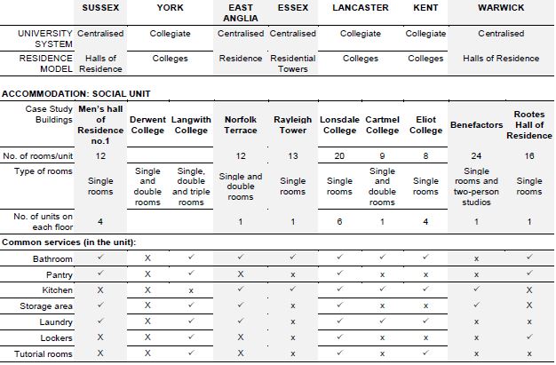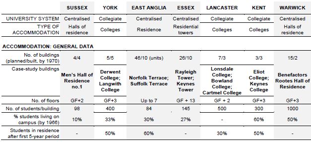 All the universities under study followed UGC accommodation guidelines, except the University of Essex, whose innovative student housing was more along the lines of shared flats. Three of the other six institutions — York, Lancaster and Kent — had a collegiate system, whilst Sussex, East Anglia and Warwick built halls of residence. Similar figures were observed in the earliest general data about available accommodation and overall figures — not surprisingly because all seven universities had a common road map based on the same education policies ( table 1 ). There are, however, no similarities in factors regarding the approach to community living, making it necessary to break the data down further into the type of housing at each university.