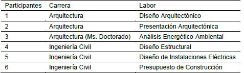 En el ejercicio participaron seis estudiantes: tres de la carrera de arquitectura y tres de la carrera de ingeniería civil, todos voluntarios y convocados por haber participado en experiencias anteriores en que demostraron un dominio básico de modelación en BIM. Dos estudiantes provenientes del cuarto año de la carrera de arquitectura, ya habían participado en una asignatura curricular que consideraba algunos ejercicios en BIM; y el tercero, un egresado de Arquitectura, Máster en Diseño Sustentable y estudiante de Doctorado, que trabaja ocasionalmente como instructor en BIM y asesor de proyectos. Los estudiantes de ingeniería civil eran de quinto año, de la especialidad de obras civiles, y habían culminado recientemente una experiencia de modelación de un edificio en BIM. No obstante, ninguno de los seis participantes había realizado un curso completo en modelación BIM, y los cinco estudiantes de pregrado tampoco habían tenido experiencias profesionales o estudiantiles multidisciplinarias. Los estudiantes de arquitectura habían tenido en su carrera actividades curriculares de desarrollo de proyectos, pero los estudiantes de ingeniería declaraban que solamente habían realizado análisis o cálculos parciales de edificios.