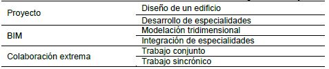 Las experiencias de colaboración extrema en el desarrollo de proyectos aeroespaciales han demostrado la capacidad de integrar grupos de trabajo ( 18 ), pero cuando se han aplicado a obras de edificación han surgido dilemas en la programación de sesiones y la convocatoria de profesionales ( 19 ). La utilización de modelación de información de edificios (BIM) también ha revelado dificultades en la capacitación y organización del personal ( 20 , 21 ), sugiriendo la aplicación de sistemas específicos de colaboración ( 22 ), como NavisWork o Autodesk360, así como una programación compartida mediante el Plan de Ejecución (denominado en inglés BEP: BIM execution plan ), con indicadores relevantes de producción (denominados en inglés KPI: key-performance-indicators ( 23 ), y considerando también salas de trabajo conjunto ( 24 , 25 ). Sin embargo, igualmente se advierte una baja colaboración entre profesionales y escasos alcances productivos ( 26 ). Todas esas carencias se detectan pese a que el desarrollo digital de los proyectos permite nuevas posibilidades expresivas en arquitectura ( 27 ). Por ese motivo, se considera relevante revisar las condiciones adecuadas para el trabajo colaborativo en los proyectos de edificación con nuevas tecnologías.