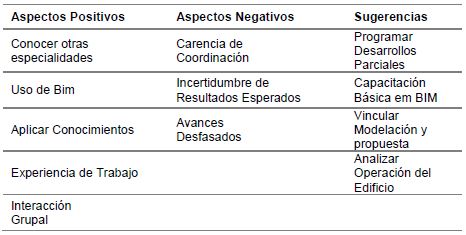 Así mismo, en la entrevista grupal plantean muy positivamente el aprendizaje de colaboración extrema (trabajar todos juntos al mismo tiempo), y también, aunque más levemente, la modelación integrada en BIM ( Figura 6 ). Reconocieron también que debieron complementar desarrollos en tiempos individuales (unas 8-10h adicionales, además de las 12h de trabajo conjunto), totalizando aproximadamente 20h cada uno, y para el grupo un total de 120h, lo que se puede estimar como el tiempo total de producción multidisciplinaria del proyecto desarrollado. En los aspectos positivos identificados reconocen fundamentalmente los siguientes; conocer formas de trabajar de otras especialidades, uso de herramientas BIM, aplicar conocimiento de su área, experiencia de trabajo aplicado, y la interacción entre personas. Entre los aspectos negativos, indican la carencia de una coordinación o jerarquía en el grupo de trabajo para resolver algunas tomas de decisiones y la incertidumbre sobre algunas condiciones de trabajo o resultados esperados (como detalles constructivos que no se habían precisado previamente o consideración de aspectos espaciales, energético-ambientales o económicos que se discutieron posteriormente). Finalmente sugieren programa parcialmente el desarrollo según especialidades, considerar capacitación básica en BIM, vincular mayormente modelación y presupuesto, y considerar análisis de operación del edificio. Valorando muy positivamente el trabajo conjunto en torno a un proyecto, aunque considerando que una mayor experiencia y planificación les permitiría programar mayormente el desarrollo y alcanzar más integradamente las metas