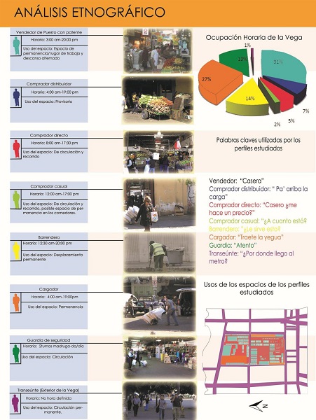 Ejemplo de informe gráfico: Mercado La Vega Central, en Santiago de Chile. Se trataba de diseñar un bloque de viviendas vecino al emblemático mercado en un terreno baldío. Los estudiantes debían identificar a la comunidad para la que iban a diseñar sus proyectos. Se estudió el mercado, los tipos de habitantes, los usos de los espacios, horarios, etc. Los estudiantes identificaron ocho tipos de personas, a las que representaron con distintos colores para relacionarlos con la ocupación espacio - temporal al interior del mercado ( Figura 1).