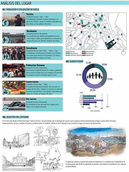 Ejemplo de informe gráfico: Viviendas-Talleres para artistas, Valparaíso, Chile. El trabajo etnográfico fue realizado en la ciudad de Valparaíso, cerca de la iglesia de la Matriz. A los estudiantes se les solicitó identificar un tipo de artista para habitar su proyecto de Viviendas-Talleres. Los estudiantes identificaron distintos tipos de habitantes del sector y estudiaron diferentes comunidades. Luego, establecieron la relación entre la volumetría de los edificios con las formas de vivir en comunidad ( Figuras 2 y 3).