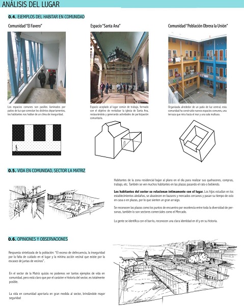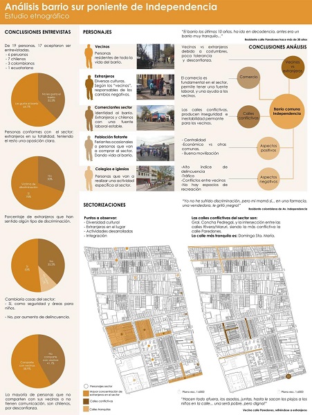 Ejemplo de informe gráfico: Viviendas interculturales para inmigrantes, comuna de Independencia, Santiago de Chile. Se realizó un estudio etnográfico en el sector sur-poniente de la comuna de Independencia, en Santiago de Chile. El objetivo era diseñar viviendas interculturales, dado el alto número de inmigrantes que vive en el sector. Los estudiantes interactuaron con habitantes procedentes de países muy diferentes y pudieron observar y comprender su vida cotidiana, sus costumbres y usos del espacio, y conocer sus necesidades ( Figura 4).