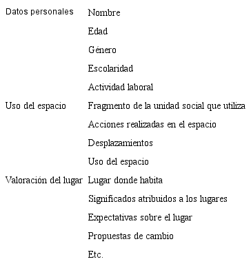 A cada entrevistado se le solicita la siguiente información: sus datos personales, el uso del espacio que hace y su valoración del lugar ( tabla 1).