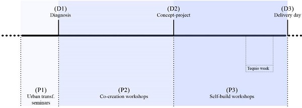 Co-creation brings a range of ideas for a project from direct users. The workshop TEA / OSW is inspired by the long-lasting “Tequio” tradition, which we described at the beginning of this paper. However, this initial idea was of course reinterpreted, to adapt the tradition to more contemporary practice and to an architecture workshop. It was developed as a participative and serious game in three main parts: urban transformation seminars (1 month), co-creation workshops (3 months) and self-build workshops (4 months) ( Fig.4). Although the co-creation workshop was proposed for the faculty of architecture of Oaxaca (UABJO - Universidad Autonoma Benito Juarez de Oaxaca, Facultad de Arquitectura CU) for students, the self-build workshops were open to the local inhabitants, who would occasionally participate. Like all games, this meant there were some rules to follow: