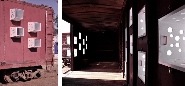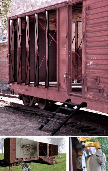 The abandoned state of this wagon was like that described above: totally enclosed, with a narrow claustrophobic space. The team, formed by three architecture students, an architect and an industrial designer, came to the same conclusions as the other groups. The space should be transformed dramatically to provide good ventilation and light and should be opened to the beautiful environment of the area. In addition, the graffiti on the wagons was a source of inspiration and a problem solver: as the wagons are abandoned, any type of graffiti protects the structure. So, why not encourage this practice on their wagon?