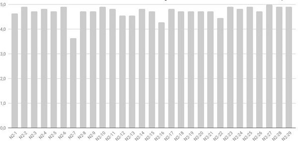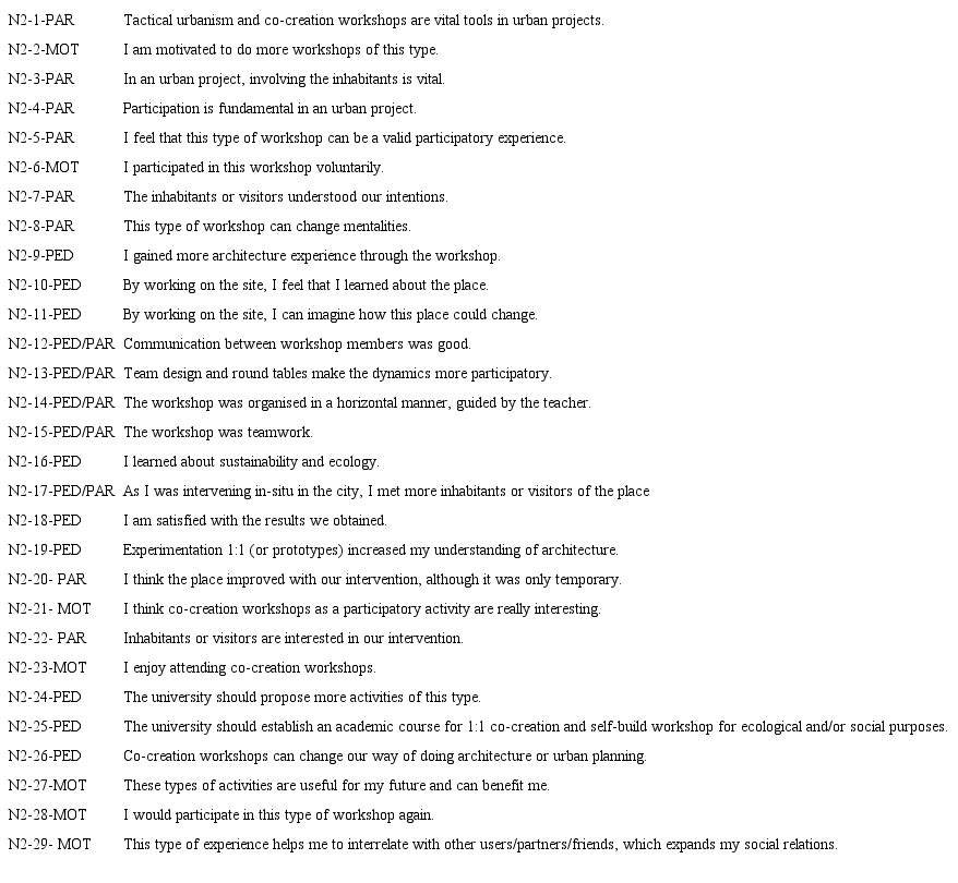 This project undertaken in 2011 was not studied in a quantitative way at the time ( 19). As part of the research TEA / OSW, we decided to ask former students, who are now professionals, to answer a questionnaire. The same questionnaire was used in the new “TEA / OSW” organised in 2018 in Barcelona with the ETSAB. The results show that it was successful as not only a participative tool, but also a social process and a way of learning about design and architecture projects. For this quantitative approach, we administered questionnaires with specific questions and details. In the first block, we obtained personal information: there were a total of 18 participants, 10 women and 10 men from 18 to 35 years old. In the second block, we designed a Likert scale so that participants could evaluate on a scale of 1 to 5 their level of agreement with statements. The participants were asked about 29 statements on various aspects: eight related to participation and social views (PAR), seven focused on motivation (MOT), nine about pedagogy (PED), and five about pedagogy and participation (PED/PAR). The results are shown in Figure 10, using the same legend (N2-number of the statement) as indicated below.