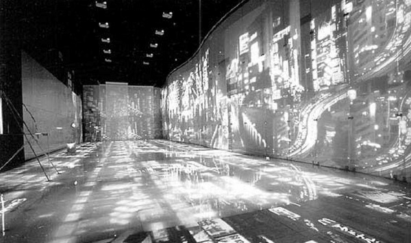 La instalación consiste en dieciocho proyectores que emiten imágenes sobre un suelo de acrílico de 10 x 28 metros, en tanto otros veintiseis lo hacen desde detrás de un plano –pantalla de 5 metros de altura–. Envuelta por aquel espacio efímero de la tecnologia electrónica, la ciudad se observa, desde arriba, como un conjunto de siluetas de edifícios iluminados a contraluz. A la altura de la mirada, con el tráfico de automóviles en las autopistas, el pasar de los textos publicitarios y el parpadeo de las luces de neón. Desde un costado, mediante grupos de personas en los videojuegos, en las paradas de autobuses, bares, restaurantes y centros comerciales, en los ascensores panorámicos o circulando en los trenes subterráneos, gente conectada a Internet, a teléfonos móviles o simplemente caminando por las calles. A través del pabellón, el visitante contempla lo que puede ser su propia experiencia visual de la ciudad: un extenso espacio de formas, reflejos, brillos, sombras y luces destellantes, que se suceden a veces sincronizadamente, a veces al azar ( figura 3)