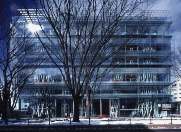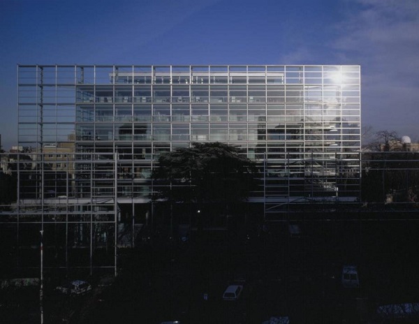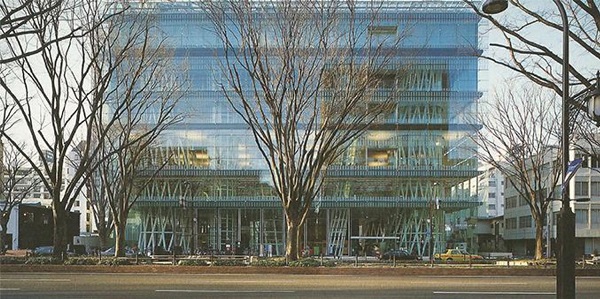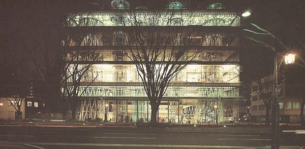 De igual modo que en el caso de la Fundación Cartier, los cambios que sufre la fachada sur del edificio, en el transcurso del ciclo solar, se deben a la incidencia de la luz y las imágenes reflejadas de los árboles y edificios de la avenida Yozenji. Durante el día, se convierte en una pantalla-espejo que deja el contenido interior débilmente denotado. Los materiales y sistemas constructivos, los contornos fusionados con el plano de cielo, todo lo concerniente a lo material de la forma, termina desvanecido entre los reflejos del entorno. Sin embargo, al llegar el crepúsculo, el proceso se invierte. La iluminación arjpgicial de los espacios interiores, al mismo tiempo que se apagan paulatinamente los elementos del exterior, termina por hacer desaparecer la fachada y, consecuentemente, convertir el edificio en un volumen efímero ( figuras 13, 14 y 15).