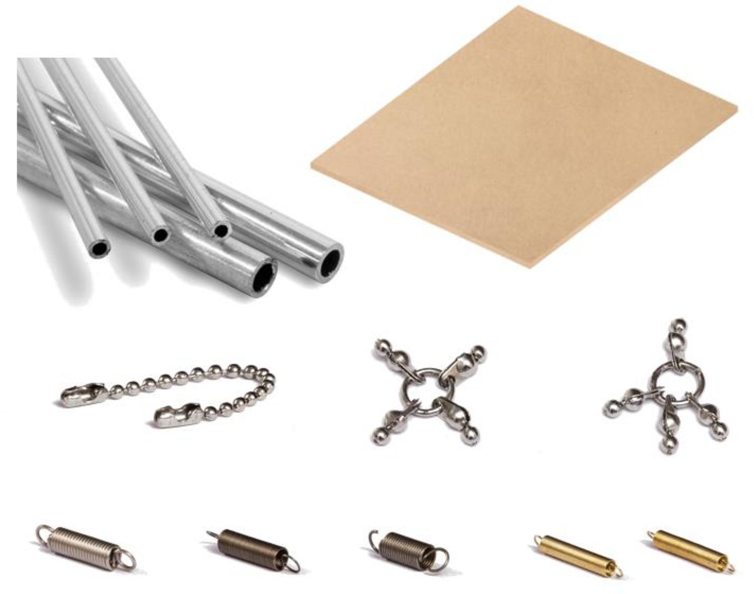 Tendo definido a função e o porte do modelo, partiu-se para a definição dos materiais utilizados. Pode-se dividir o modelo em 5 componentes distintos, que foram: a placa de base, as hastes rígidas, as correntes, as molas e os nós, conforme ilustrado na Figura 1. Para cada componente, foi definido um material diferente, de acordo com suas funções.