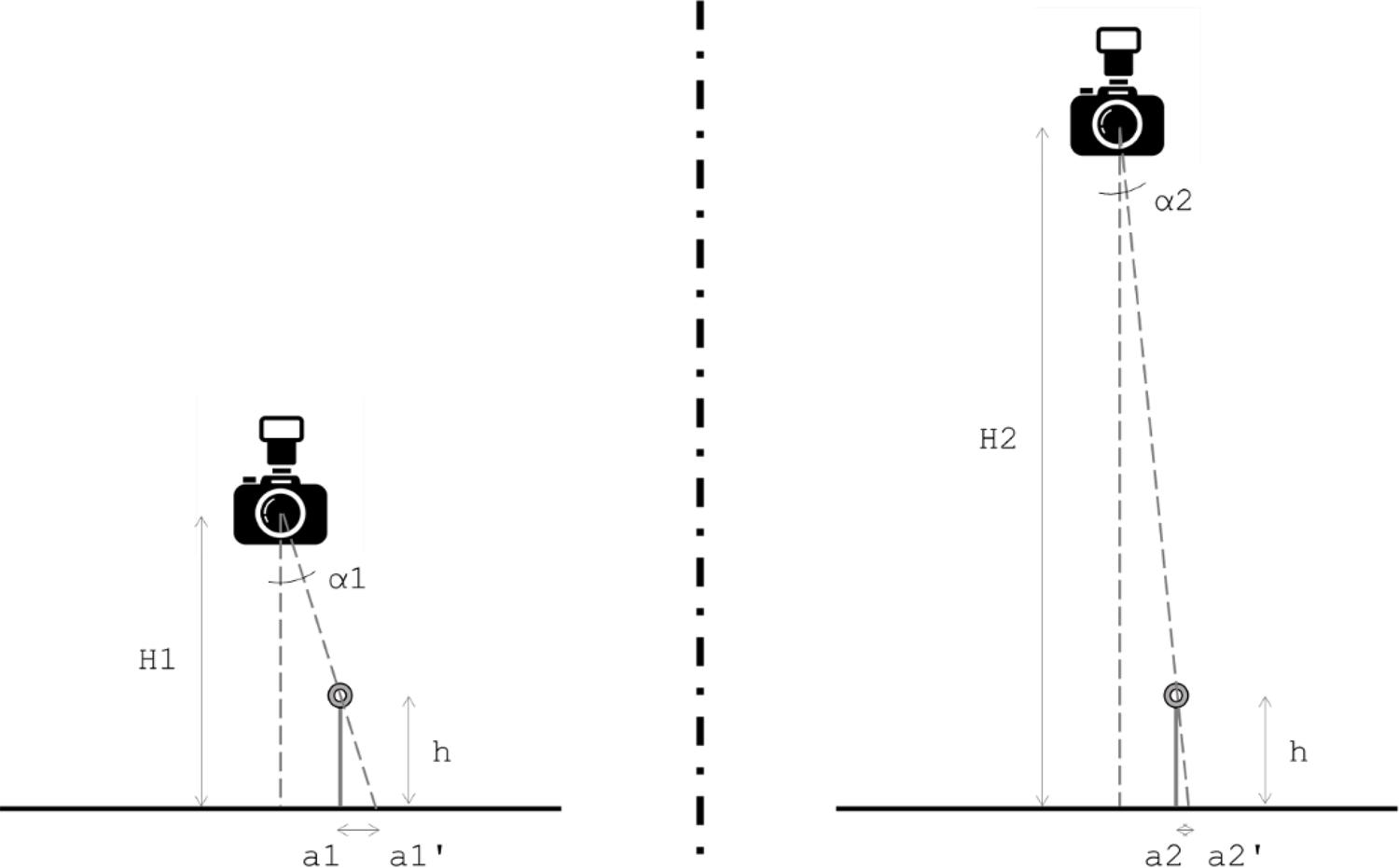 A Figura 2, a seguir, mostra como a distância entre a câmera e o objeto fotografado influencia na distorção da posição aparente do objeto. No lado esquerdo da figura, há a situação com a fotografia sendo realizada próxima – à distância de H1 – do objeto estudado – representado pelo círculo cinza, na posição a1 e altura h do anteparo de medição. Nessa primeira situação é possível perceber que a posição aparente do objeto será a1’, ao invés de a1. Essa distorção, a1 – a1’, depende do ângulo de abertura α1, da altura da câmera H1 e da altura do objeto h. Na situação representada no lado direito da imagem, alterou-se apenas a altura da câmera de H1 para H2. Mantendo-se a altura do objeto constante em h, o ângulo da câmera diminuiu para α2. Consequentemente, como pode-se notar, a posição distorcida a2’ é mais próxima à posição real a2.