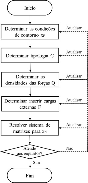 O procedimento entrega como resultado as coordenadas dos nós da malha de cabos e as reações nos apoios. A partir desses dados, é possível avaliar se a resposta do algoritmo atende às necessidades do usuário como, por exemplo, altura do pé-direito da cobertura ou alguma outra condição almejada. Com base nessas restrições, o algoritmo, por meio de iterações e de forma automatizada, altera as densidades de forças inicialmente determinadas e reinicia o método com os novos dados. Tal procedimento deve ser repetido por um número determinado de vezes ou até que sejam atendidos os requisitos do usuário, de acordo com fluxograma a seguir.