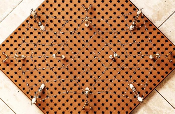 Outra etapa de significativa importância na eficácia do modelo foi a definição da metodologia utilizada para a obtenção das informações providas pelo modelo físico, como coordenadas de nós e dimensões dos cabos. Nesse trabalho, as medições foram realizadas por meio de fotografias, método semelhante aos aplicados por Frei Otto em seus modelos físicos ( 8).