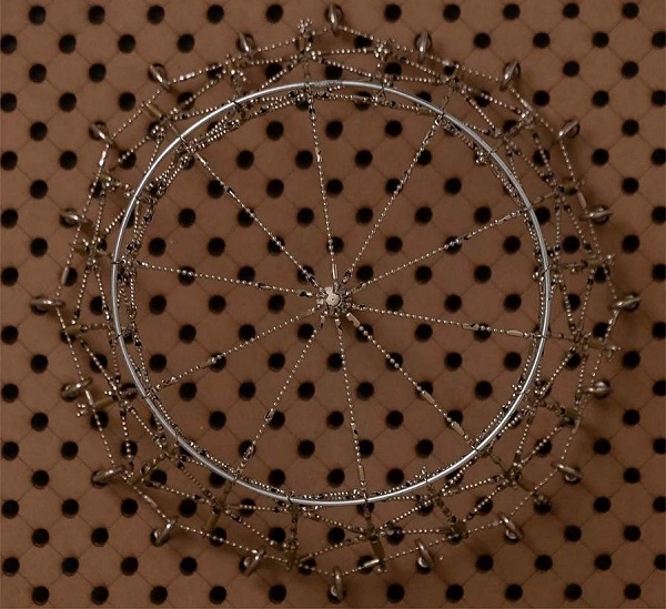 Seguindo a mesma proposta dos cabos, os nós dos modelos foram pensados para serem os mais adaptáveis possível. Nesse sentido, era interessante que não houvesse limitação para o número de conexões possíveis em um mesmo nó e nem restrições quanto ao ângulo de chegada dos cabos. Os nós foram compostos por argolas de ferro banhadas a níquel e terminais do tipo “tip”.