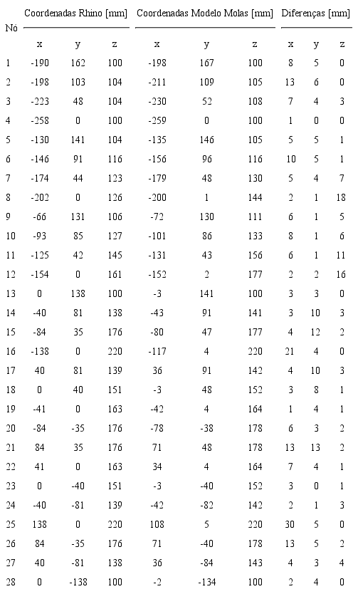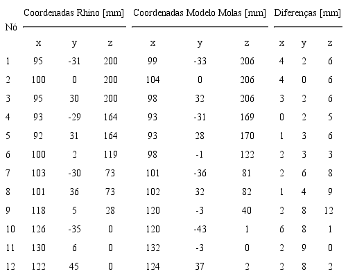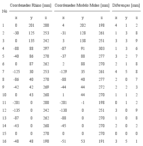Era esperado que as divergências fossem maiores nas coordenadas dos nós do que nos comprimentos dos cabos. O motivo dessa expectativa foi um controle mais refinado das dimensões dos cabos, uma vez que o seu comprimento depende basicamente do número de bolinhas em cada segmento. As coordenadas dos nós, ao contrário, podem variar por pequenas imprecisões que vão se acumulando conforme a complexidade da estrutura. Outra jusjpgicativa pode ter sido a falta de controle da posição dos pontos fixos, principalmente em casos em que os apoios estavam distantes da placa de base. Os resultados da comparação podem ser observados na Tabela 1.