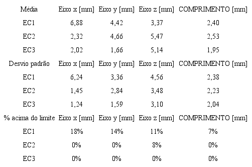 A Tabela 4 apresenta as médias de divergências entre modelos e seus respectivos desvios padrões. A tabela é dividida nos três estudos de caso e apresenta informações referentes aos três eixos de coordenadas (x, y, z) e ao comprimento dos elementos de barra. Nela é possível observar que houve significativa redução das médias de erros e dos desvios padrões do EC3 em relação ao EC1. Avalia-se, portanto, que a realização dos estudos de caso, apresentados ao longo desse artigo, foi fundamental para contribuir com o aprimoramento da técnica de concepção com modelos físicos.