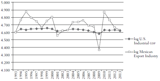 Therefore, it can be clearly stated that the dynamics of Mexican manufacturing exports are characterized by a strong concentration of exports in a very small number of manufactures. If we consider, as mentioned previously, that Mexican exports mainly go to the U.S., it can be concluded that Mexican manufacturing exports depend on the dynamics of the U.S. economy. This characteristic of Mexican manufacturing reflects this sector's high dependency on a single foreign market and the lack of diversification that significantly reduces its capacity to handle the recessionary shocks of the U.S. economy, as observed in the last economic recession of 2008 and 2009.