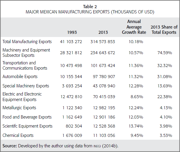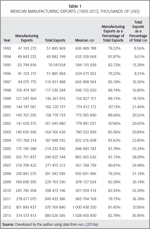 Total exports as a percentage of GDP rose from 8.56 percent in 1993 to 36.95 percent in 2013, more than a four-fold increase (Table 1). This remarkable expansion revealed the new opportunities for Mexican exports in the U.S. market, under the liberalization of the Mexican economy and the favorable conditions for receiving important flows of foreign direct investment. However, several aspects of the Mexican trade in manufactured goods are important to address because they show limitations to the manufacturing exports model based on the dynamics generated by the economic integration encouraged by NAFTA.