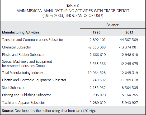 On the other hand, most Mexican manufacturing activities showed a constant and increasing trade deficit from 1993 to 2013. Among the manufacturing activities that exhibited higher trade deficits in that period were the transport and communications subsector, whose trade deficit increased from US$2.89 billion to US$44.37 billion, with an average annual rate of 13.65 percent, and the chemical subsector, which increased from US$23.30 billion to US$13.37 billion (Table 6). Other manufacturing industries that exhibited trade deficits are plastic and rubber, electric and electronic equipment, steel, printing and publishing, and textiles and apparel.