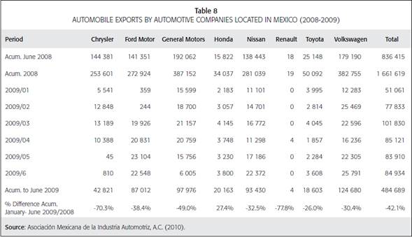 All of this revealed that, although the crisis of the automotive industry was a problem related to the international economic recession, the U.S. car companies were the ones that experienced the most severe contraction in Mexico, therefore demonstrating the negative side of the integration of the manufacturing sector achieved by NAFTA.
