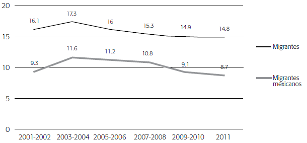 El caso de Arizona se observa en la gráfica 2. Allí, a partir de la crisis inmobiliaria, cuyos primeros referentes se dan en 2007-2008, inicia un declive de migrantes mexicanos, lo cual se aprecia en el decrecimiento de la migración mexicana respecto del total de la población de ese estado: baja del 11.2 por ciento en 2005-2006 al 10.8 por ciento en 2007-2008, para continuar prácticamente en picada hasta el 2011, cuando el número de migrantes mexicanos en Arizona (recordemos que es vecino de Sonora) cae al 8.7 por ciento, la presencia más baja en el tiempo transcurrido desde el siglo XX. En la gráfica se puede observar también que, en relación con migrantes de otros países, es la mexicana la que más ha decrecido.