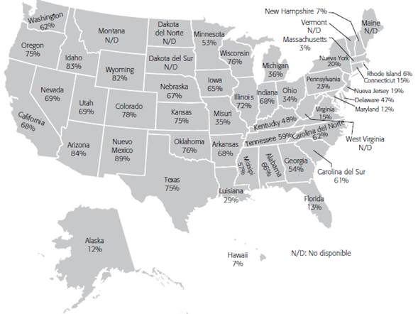 El mapa 1 amplía la información anterior: indica el porcentaje de mexicanos indocumentados por estado, respecto al total. Destaca la caída relativa de California y el incremento en la vecina Arizona, estado estratégico para la población migrante. Por el sureste estadunidense, Texas mantiene una tendencia histórica de migrantes mexicanos indocumentados. Sin embargo, como también se observa en el mapa, sólo seis estados no presentan información de migración mexicana indocumentada. En términos generales, la distribución territorial de los migrantes mexicanos en el vecino país, por un lado, sigue presentando un alto índice de concentración en los estados fronterizos y, por otro, dispersión relativa en otros estados.
