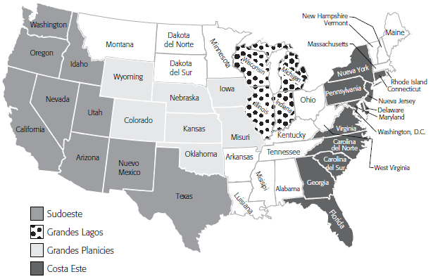 La primera región es la del sudoeste, que incluye los cuatro estados fronterizos: California, Arizona, Nuevo México y Texas; y en una segunda fase de expansión abarca a algunos estados adyacentes: Nevada, Utah, Oregon, Washington e Idaho. En segundo término, figura la región de los Grandes Lagos, que se articula en torno a la ciudad de Chicago y que abarca los estados de Illinois, Indiana, Michigan y Wisconsin. La tercera región de corta duración, fue las de las Grandes Planicies, que se articuló en torno al centro ferrocarrilero de Kansas y que al parecer, en estos momentos está en proceso de reconstrucción. Comprende los estados de Colorado, Kansas, Iowa, Misuri, Nebraska, Oklahoma y Wyoming. Finalmente, hay que tomar en cuenta a una nueva región, en proceso de formación, la del corredor de la Costa Este, que va de la Florida a Connecticut y que incluye, entre otros, a los estados de Georgia, las Carolinas y Nueva York (Durand, 2005).