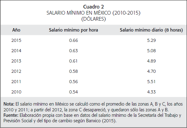 Los datos del cuadro 1 se contrastan con los de México que vemos en el cuadro 2, donde se observa que en Estados Unidos, durante el lapso de 2010 a 2015, por ocho horas de trabajo diarias, se obtiene una remuneración de 58 dólares; en cambio, en México, la remuneración durante el mismo periodo es de 4.96 dólares, considerando el dato promedio. Dicho de otra manera: un trabajador mexicano necesita trabajar 11.96 días para ganar lo que como migrante gana en un día, en Estados Unidos.