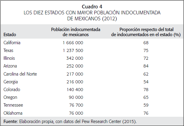 En el cuadro 4 se advierte la cantidad de población absoluta de indocumentados mexicanos en los diez principales estados, así como el porcentaje, respecto del total de la población indocumentada. California, Texas, Arizona y Nuevo México, los estados fronterizos, acumulan el 72 por ciento de la población indocumentada mexicana. El 28 por ciento restante se dispersa en cuarenta estados de la Unión, entre los cuales sobresalen Georgia, Illinois y Carolina del Norte, con una población de setecientos cincuenta mil habitantes.