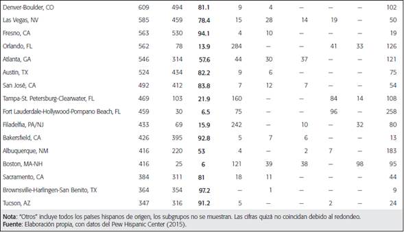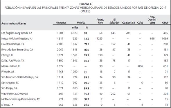 Las evidencias estadísticas de esta dinámica de reacomodo migratorio de mexicanos se empalman con las de los mexicoamericanos radicados legalmente en el país, donde los mexicanos son ostensible mayoría comparados con la población hispana. Según se observa en el cuadro 4, hay una alta concentración en las regiones y estados mencionados, así como en zonas metropolitanas como la de Los Ángeles-Long Beach, California (el 78 por ciento); Houston-Brazoria, Texas (el 77.5 por ciento); Riverside- San Bernardino, California (el 88 por ciento); Chicago, Illinois (el 79.2 por ciento); Dallas-Fort Worth, Texas (el 85.4 por ciento); Phoenix, Arizona (el 91 por ciento), San Antonio, Texas (el 90 por ciento); y San Diego, California (el 90 por ciento). La otra parte de la distribución está constituida por la dispersión de la población mexicana en el resto de los estados y ciudades estadunidenses, entre las que destacan Fresno, California (el 91 por ciento), McAllen-Edinburg-Pharr-Mission, Texas (el 98 por ciento); Denver-Boulder, Colorado (el 81 por ciento); Tucson, Arizona (el 91 por ciento), entre otras zonas metropolitanas observables en el cuadro 4.