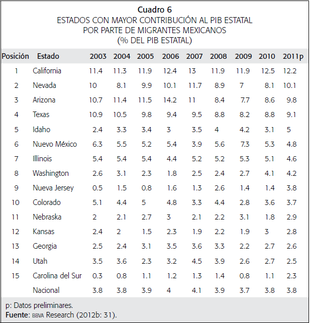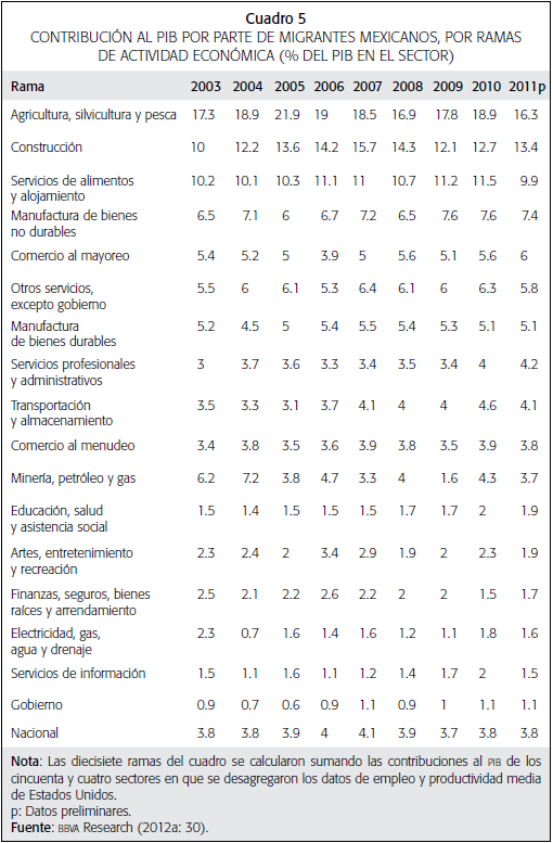 La presencia de migrantes mexicanos en Estados Unidos tiene varios significados. Forman comunidades fácilmente identificables con respecto a otras migraciones como la asiática o la proveniente de Centro y Sudamérica. El apego al idioma español y a ciertos hábitos alimenticios, religiosos y de convivencia configura una cultura de características homogéneas, que difícilmente se integra al modo de vida de la población anglosajona. 7 Igualmente se identifica por los sectores y ramas de la economía donde laboran y realizan significativas aportaciones al producto interno bruto (PIB) de Estados Unidos: agricultura, silvicultura y pesca, construcción, servicios de alimentos y alojamiento, manufactura de bienes no durables y comercio mayorista. El cuadro 5 brinda la evidencia estadística.
