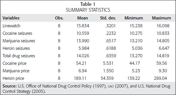 To assess the relationship among the variables of interest, we used bivariate regression analysis. It is worth mentioning that the choice of method may limit the relevant findings, since control variables that could also influence the dependent variables are not being considered, such as international efforts, including crop eradication and substitution, international enforcement agreements and treaties, as well as state and local drug enforcement, including the number of drug-related arrests, resulting in omitted variable bias. Nevertheless, this study is an attempt at an initial understanding of how border enforcement impacts critical variables related to the illegal drug trade. Table 1 presents the summary statistics for the variables used in the study.