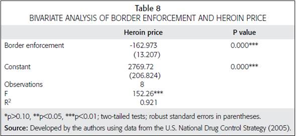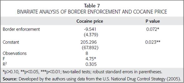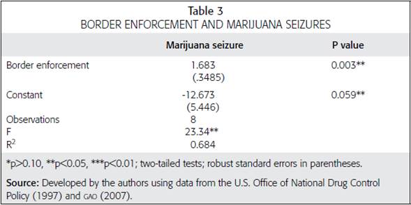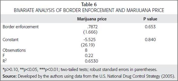 Results regarding the relationship between border enforcement and illegal drug prices are presented in Tables 6 , 7 y 8 , some of which are interesting. Although marijuana has been heralded as the most interdicted and, as a result, the most likely drug to be influenced in terms of price by border enforcement efforts, this study's results disprove hypothesis 4, since no statistically significant relationship was found between border enforcement and the price of marijuana.
