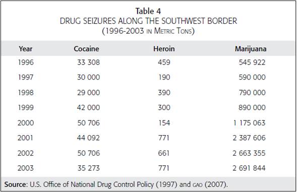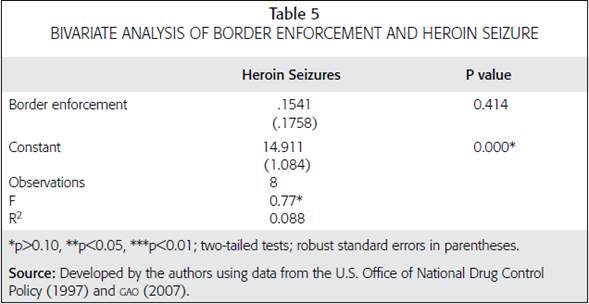 Results regarding the influence of border enforcement on heroin seizures showed it was not significant. Heroin has often been touted as the least likely drug to be seized and the most difficult drug to interdict given the ease with which individuals can hide it. Data in Table 4 indicate the small amount of heroin seized along the U.S.- Mexican border annually, particularly when compared to cocaine and marijuana.