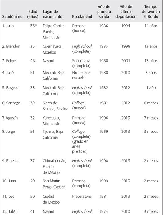Estos datos coinciden con las experiencias narradas por personas que viven o han vivido en El Bordo en los últimos cinco años y que constituyen nuestros casos de estudio. Algunos fueron detenidos y deportados por no tener documentos migratorios y otros fueron enjuiciados por algún delito y luego deportados desde alguna cárcel. El Cuadro 1 muestra su condición común de deportación en los últimos años. Llama la atención que seis de los doce entrevistados salieron por primera vez de sus lugares de origen a principios de los ochenta; nueve fueron deportados por última vez entre 2010 y 2013, lo cual corresponde al periodo de mayores deportaciones. Tres de los doce entrevistados llevan más de diez años en El Bordo, dos de ellos entre uno y tres, y el resto menos de uno. Su edad promedio es de treinta y nueve años, pero sus lugares de origen y escolaridad son sumamente variados.