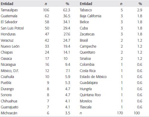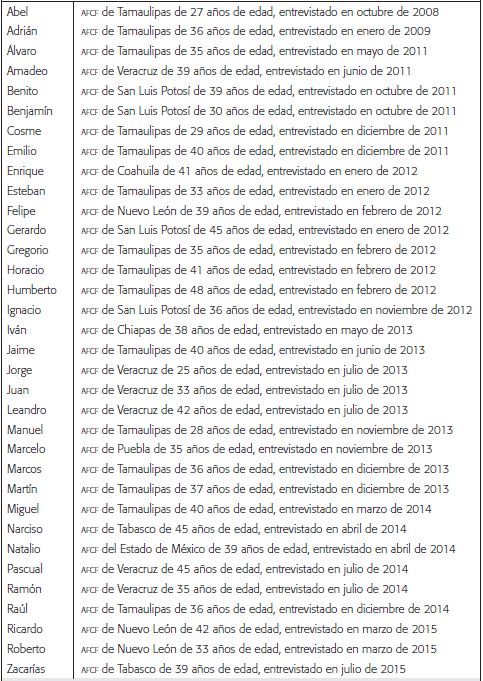 El trabajo de campo se llevó a cabo entre 2008 y 2015. En este periodo de siete años, fueron entrevistados 170 AFCF. Más de la mitad de los entrevistados eran originarios de Tamaulipas, y más de un tercio nacieron en Veracruz, San Luis Potosí, Ciudad de México, Nuevo León y Chiapas. El resto de los entrevistados eran originarios de Puebla, Estado de México, Guanajuato, Sonora, Coahuila, Texas, Chihuahua, Tabasco y Guerrero (véase cuadro 1).