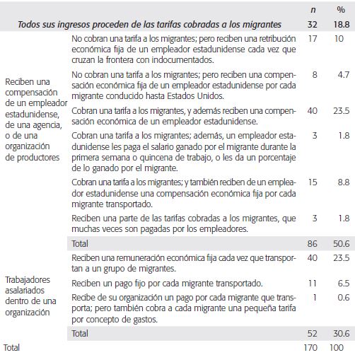 Los resultados del cuadro 4 plasman el alcance de la participación de los empleadores en el tráfico de migrantes. Menos de una quinta parte de los entrevistados afirmó que sus ingresos provenían sólo de las tarifas que cobraban a los migrantes. Algo más de la mitad habían sido contratados por un empleador estadunidense, por una asociación de productores o trabajaban para una pseudoagencia de contratación de migrantes indocumentados, a cambio de lo cual recibían una compensación económica. Casi una sexta parte de los entrevistados no cobraban tarifas a los migrantes; sus ganancias procedían únicamente del dinero que recibían del empleador. Uno de cada diez recibía una compensación económica fija, cada vez que conducían migrantes hasta el norte, y casi uno de cada veinte recibía un pago por cada migrante transportado. El resto (más de un tercio) cobraba una tarifa a los migrantes; pero además eran compensados económicamente por un empleador estadunidense. Casi una cuarta parte recibía un pago cada vez que cruzaba con los migrantes y quince recibían una compensación económica por cada migrante transportado. Tres cobraban el salario ganado por los migrantes durante los primeros días de trabajo, o recibían un pequeño porcentaje de su salario. En otros tres casos, los af recibían un porcentaje de las tarifas pagadas por los migrantes, que en ocasiones eran abonadas por los empleadores.