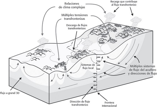Para Wagner Costa, el diseño de una soberanía interdependiente es uno de los instrumentos más efectivos que coadyuvan al reconocimiento de la dimensión política de las aguas transfronterizas, toda vez que ésta resulta de los problemas transfronterizos y, por lo tanto, exige una actuación conjunta de los países limítrofes. En ese sentido, el tratamiento y estudio de las aguas subterráneas transfronterizas debe ser interdisciplinario, porque como lo han planteado los hidrogeólogos en su formulación de la teoría de los sistemas de flujo (Tóth, 1970; Carrillo-Rivera y Cardona, 2012) estas gestiones exigen responsabilidades compartidas en las que es prioritario identificar y reconocer los componentes verticales y horizontales hídricos que las fronteras atraviesan, y que tienen una relación directa con las zonas de descarga y recarga situadas de forma indistinta en cada uno de los territorios fronterizos de los estados que comparten las aguas subterráneas situadas en los acuíferos transfronterizos.2
