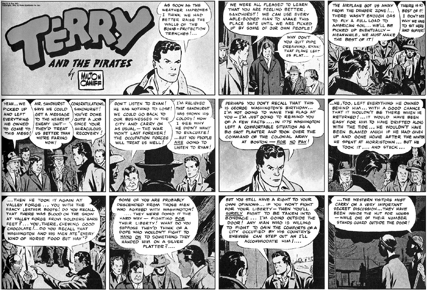 The side that takes to Caniff is not difficult to guess, given the long list of awards he has received in 20 years. They have been bestowed by the establishment for his comprehensive Americanism, for the values that his two greatest characters have been the most convincing advocates of and propagandists for....He believes in a certain type of society, in a community that does not have the right to relax “during peacetime” because the enemy is always at the gates, in a youth that should be filled with pride when put in uniform, in the veterans who meet every year to celebrate “flag day,” in war widows “who would not change places with any other woman in the world.” His message is for Order, Strength, Patriotism. (1969: 16)