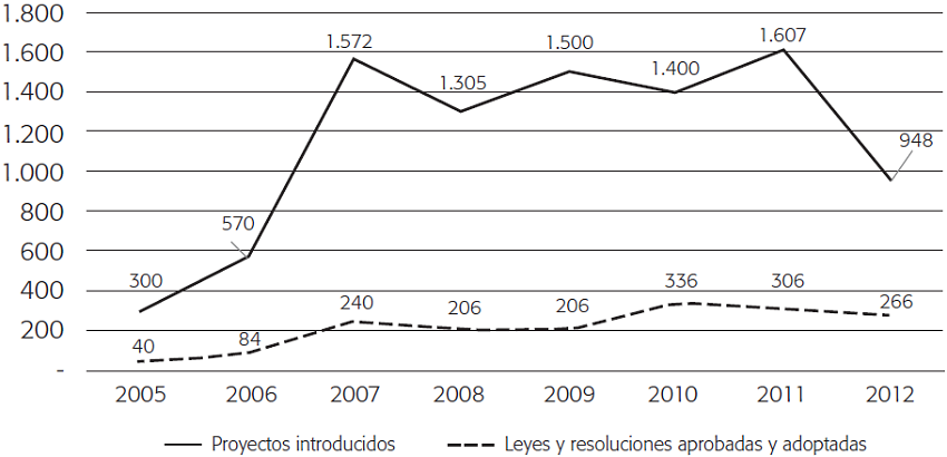 Desde el año 2005 y hasta el 2012, los cincuenta estados que componen la Unión Americana aprobaron y adoptaron alrededor de 1418 leyes y resoluciones relacionadas con la inmigración sobre un total de más de 8254 iniciativas legislativas (véase Gráfica 1).